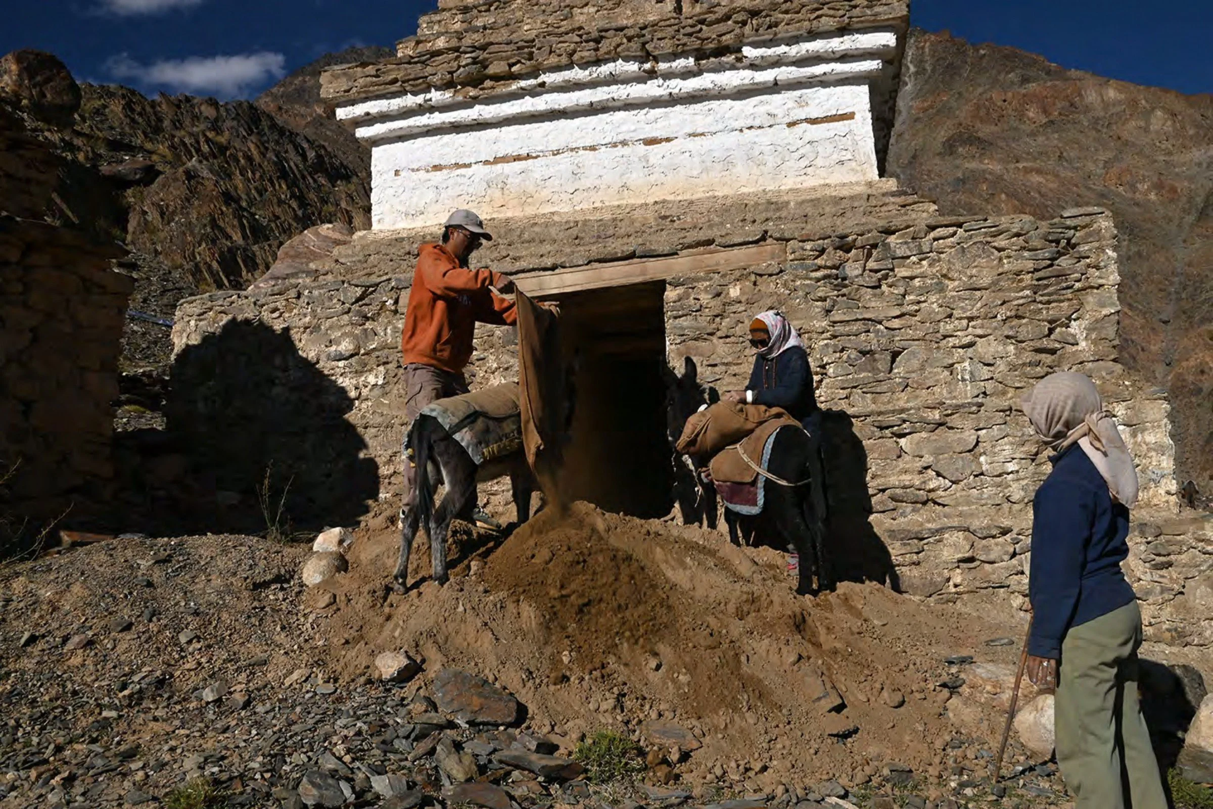 Local construction workers unload vernacular building materials transported by donkey at Kadhampa Chorten.