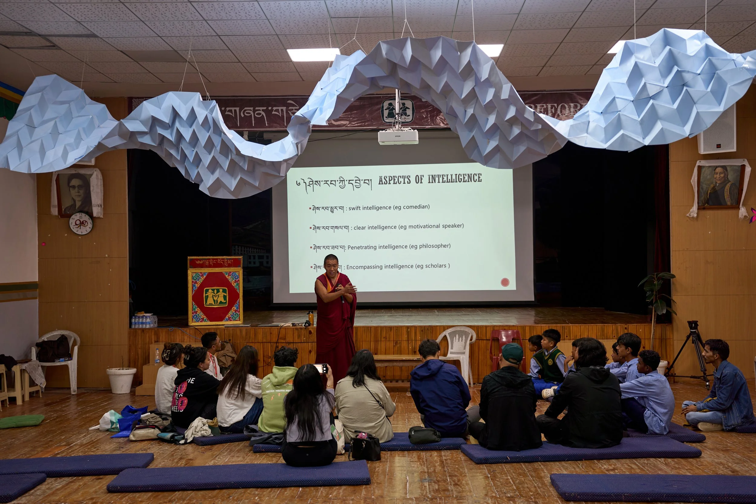 Studio Nyandak’s origami river flows above a monk presenting on Tibetan Buddhist philosophy to festival youth.